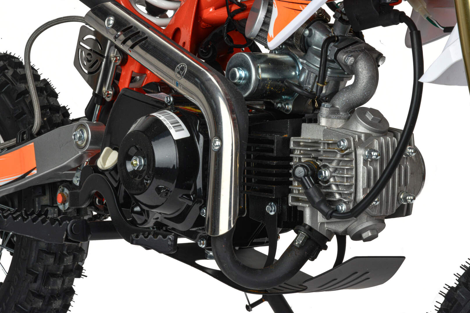 Питбайк оснащён карбюратором PE19 и одноцилиндровым четырёхтактным двигателем с воздушным охлаждением. Надёжный мотор мощностью 8 л. с. и объемом 110 см³ разгоняет питбайк до 70 км/ч. Трансмиссия - вариатор. Система зажигания электронная (CDI). Запуска двигателя - электростартер.
